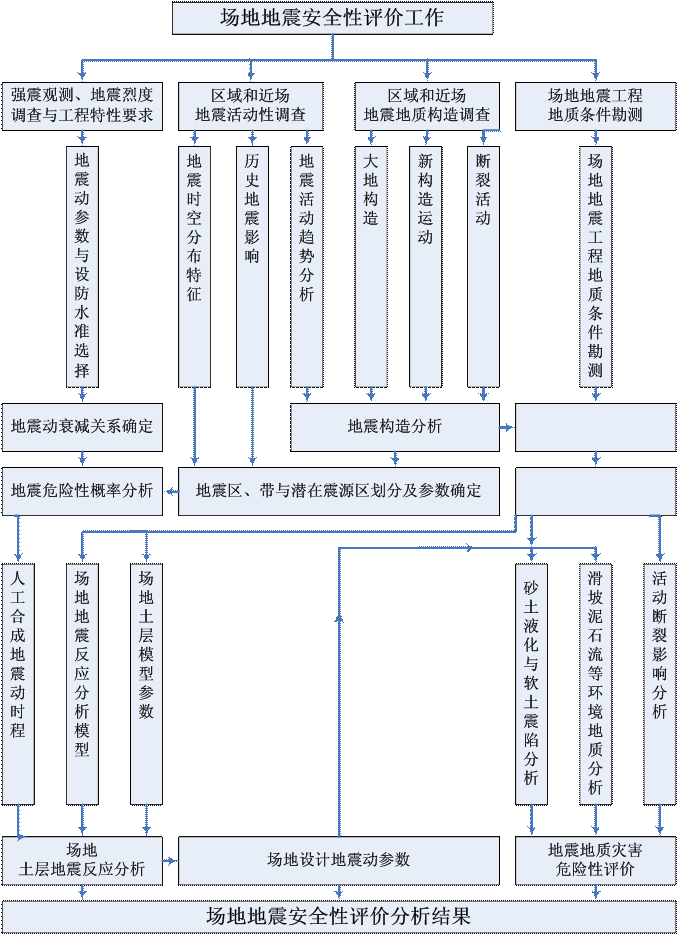 地震******性评价工作首先要进行工程区域(一般为半径150--300公里的矩形区域)、近场(一般为半径25公里的矩形区域)地震地质研究,确定可能发生大地震的地点、强度、机制(即确定潜在震源区);通过强震观测结果(包括宏观的烈度考察等、微观的强震记录等)和现场详细研究,了解地震波传播途径,得到工程所在地区的地震动衰减规律;然后根据场地条件,得到工程场地的地震危险性评价结果。根据工程特性,工程地震******性评价的结果提供50年或100年一定超越概率(一般为63%、10%、3%、2%)条件下的设计地震动参数。